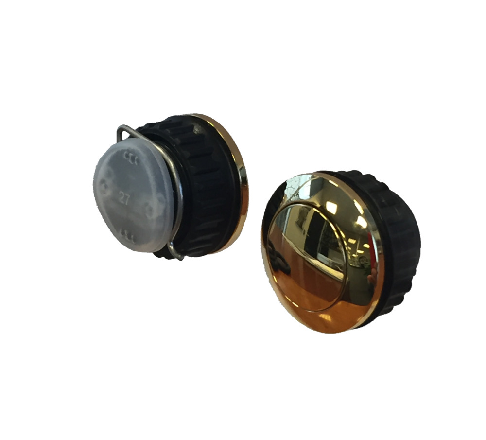 Messing vergulde behuizing én bolle dome bouton | Max. 24V AC/DC - 1,5Amp | Vergulde insteek contacten bedrading (0,6mm - 0,8mm) inclusief speciale tool voor losmaken | Kunststof montagering | Rubber seal voor extra afdichting insteekcontacten | IP 54; stof en spatwaterdicht | Voor plaatdikte tussen 0,5 en 6 mm