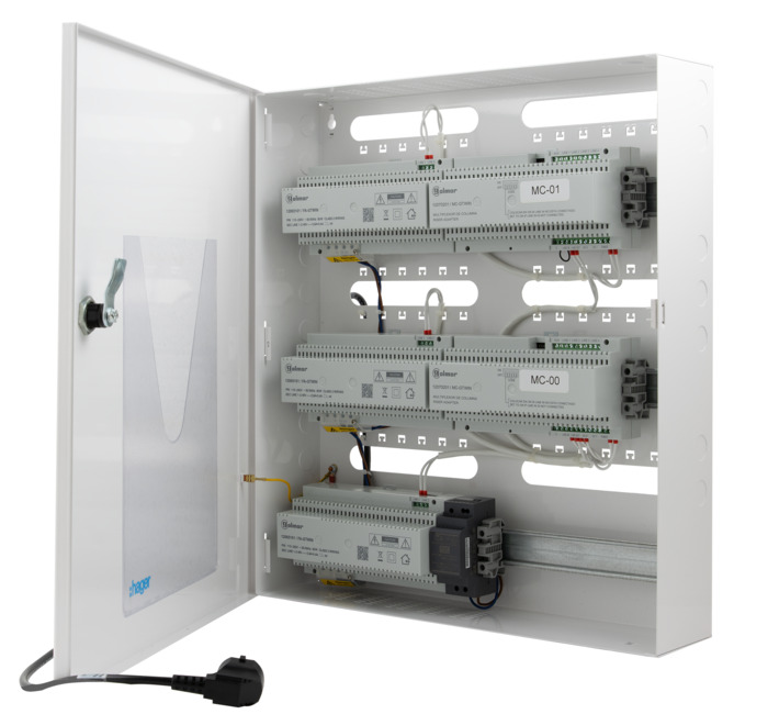 Kast van 1 mm dik staal, gepoedercoat in RAL 9003. Ventilatiesleuven. Scharnierende deur; afsluitbaar.
